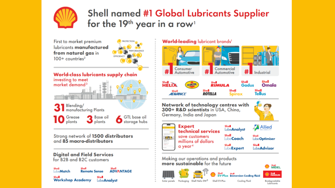Kline ranks Shell as the #1 global lubricants supplier based on finished lubricants sales volumes across automotive and industrial segments worldwide. According to the report, Shell has maintained its leading position with a global market share of 11.6%, with global sales in 2024 being split almost evenly between the three segments: 37% consumer automotive, 32% industrial, and 31% commercial automotive.